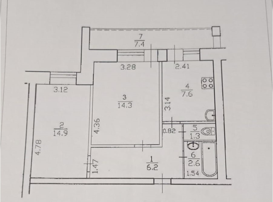 Жилая площадь 35 кв.м, кухня 7.4 кв.м, лоджия 7 кв.м