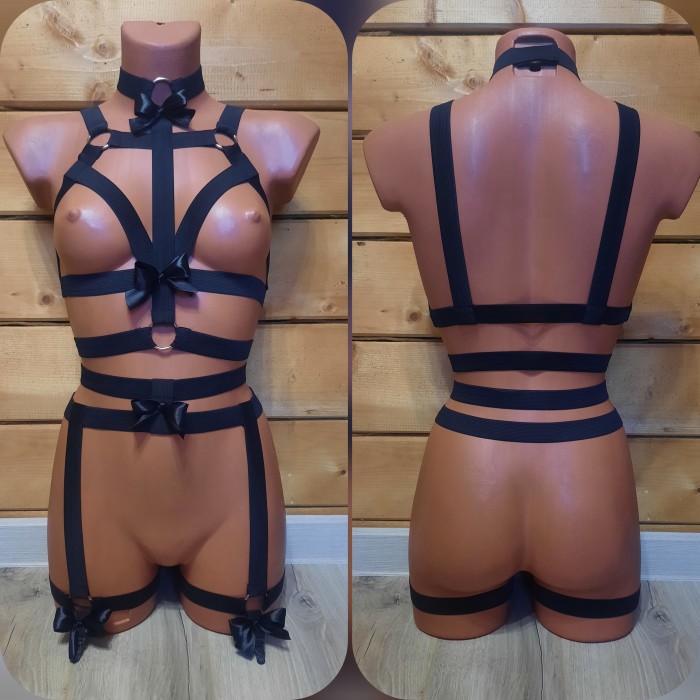 Комплект из мягких эластичных лент-резиночек (портупея и пояс с подвязками для чулок) прекрасно садится по фигуре и подчеркивает изгибы тела. А маленькие черные бантики придают образу игривость.