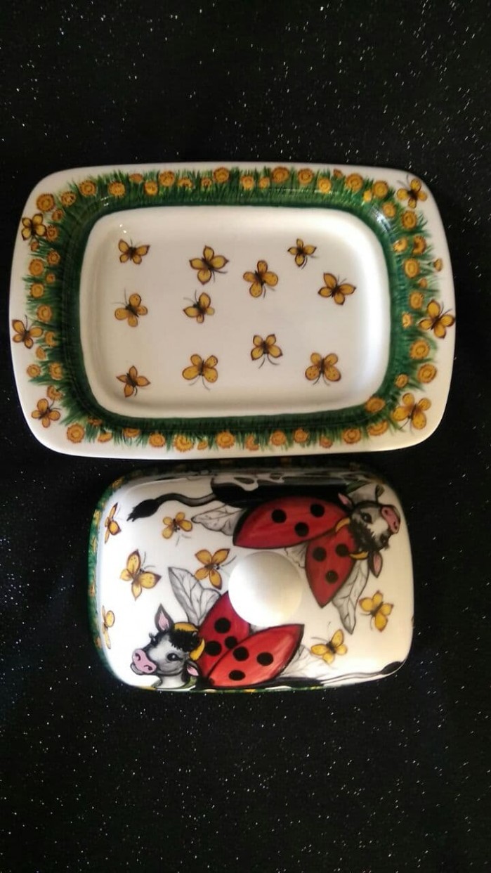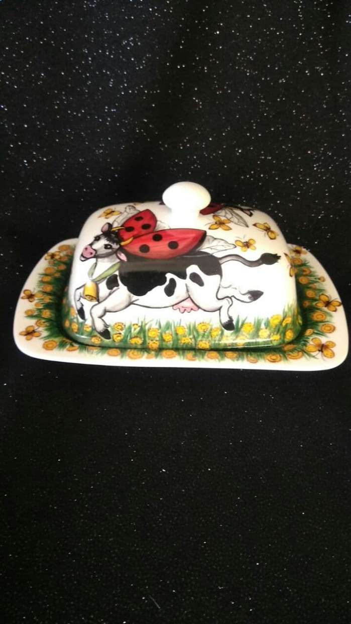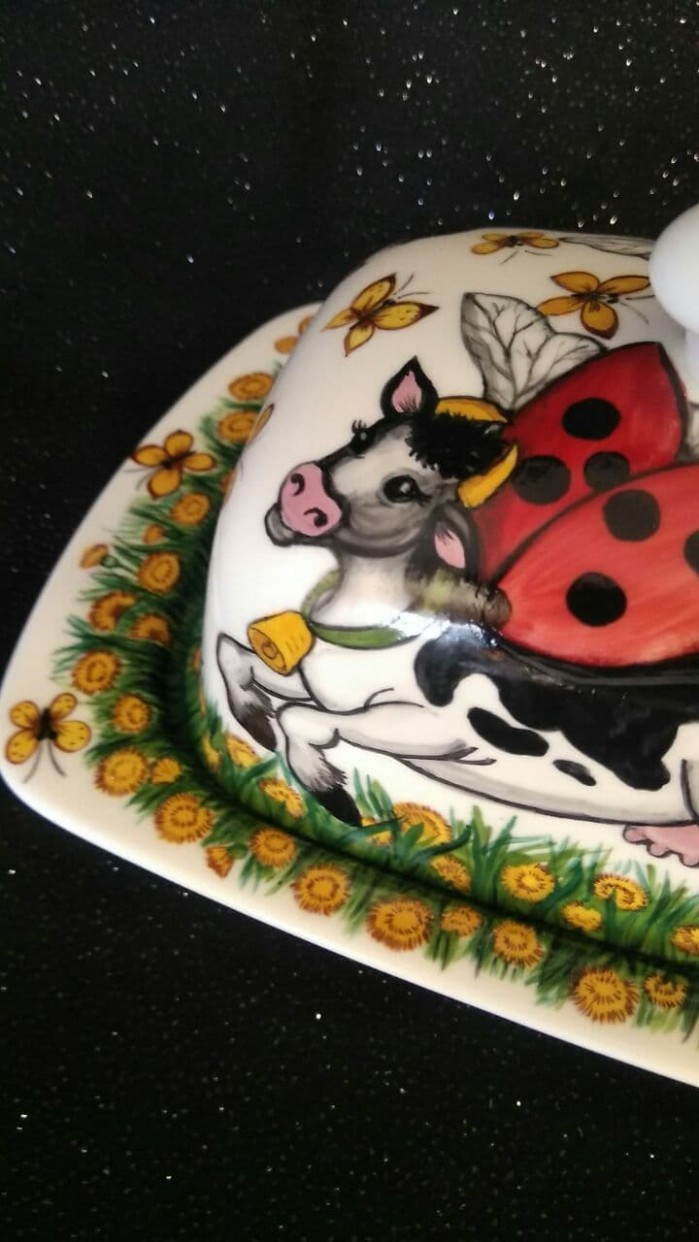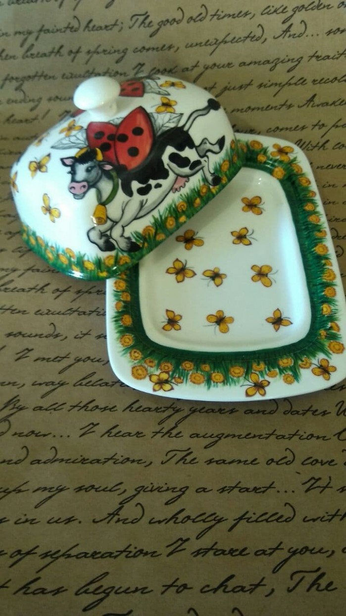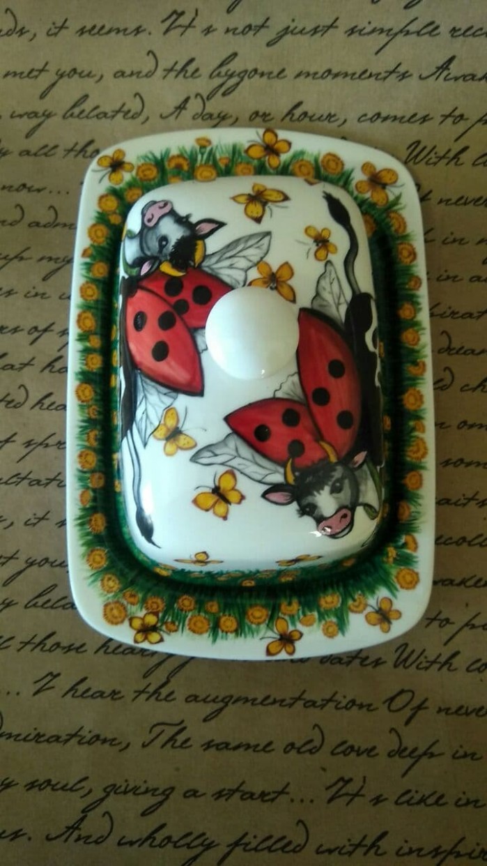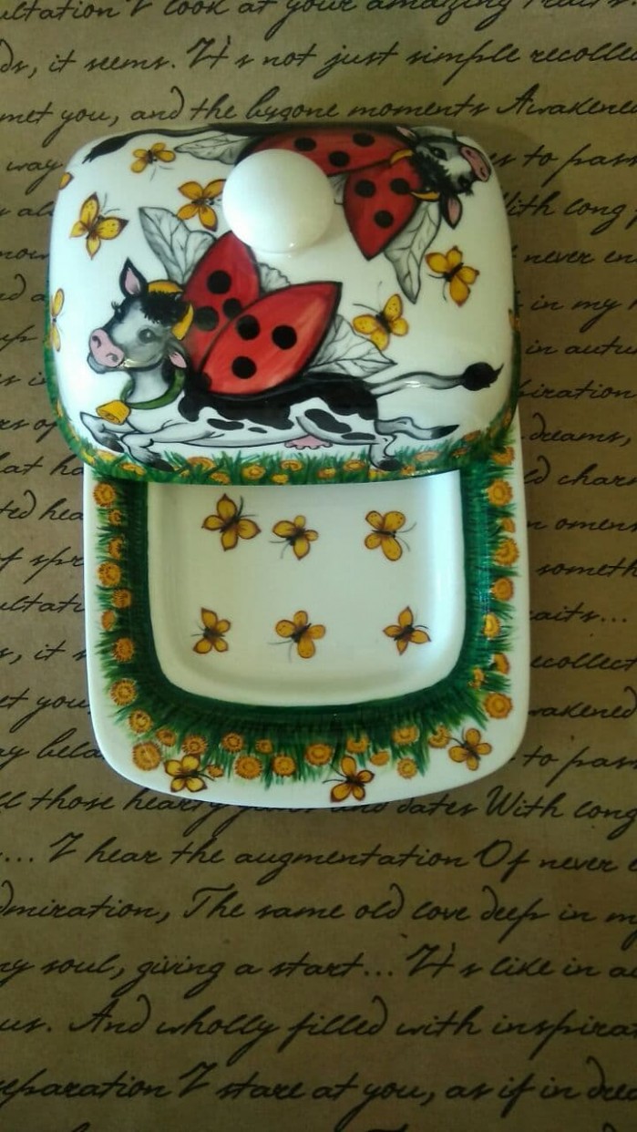 Представляю вашему вниманию позитивную, радостную свою работу. Думаю, что если на столе будет стоять эта маслёнка, то за столом будет хорошо и радостно! Фарфоровая маслёнка " Божьи коровы" Надглазурная роспись сертифицированными красками. Многократный обжиг при температуре 800 градусов. Цена 5500